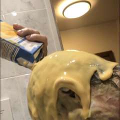 Head dunked straight away in the bucket of toxic looking orange gunge and made to sit as it's poured over her head and into her clothes.